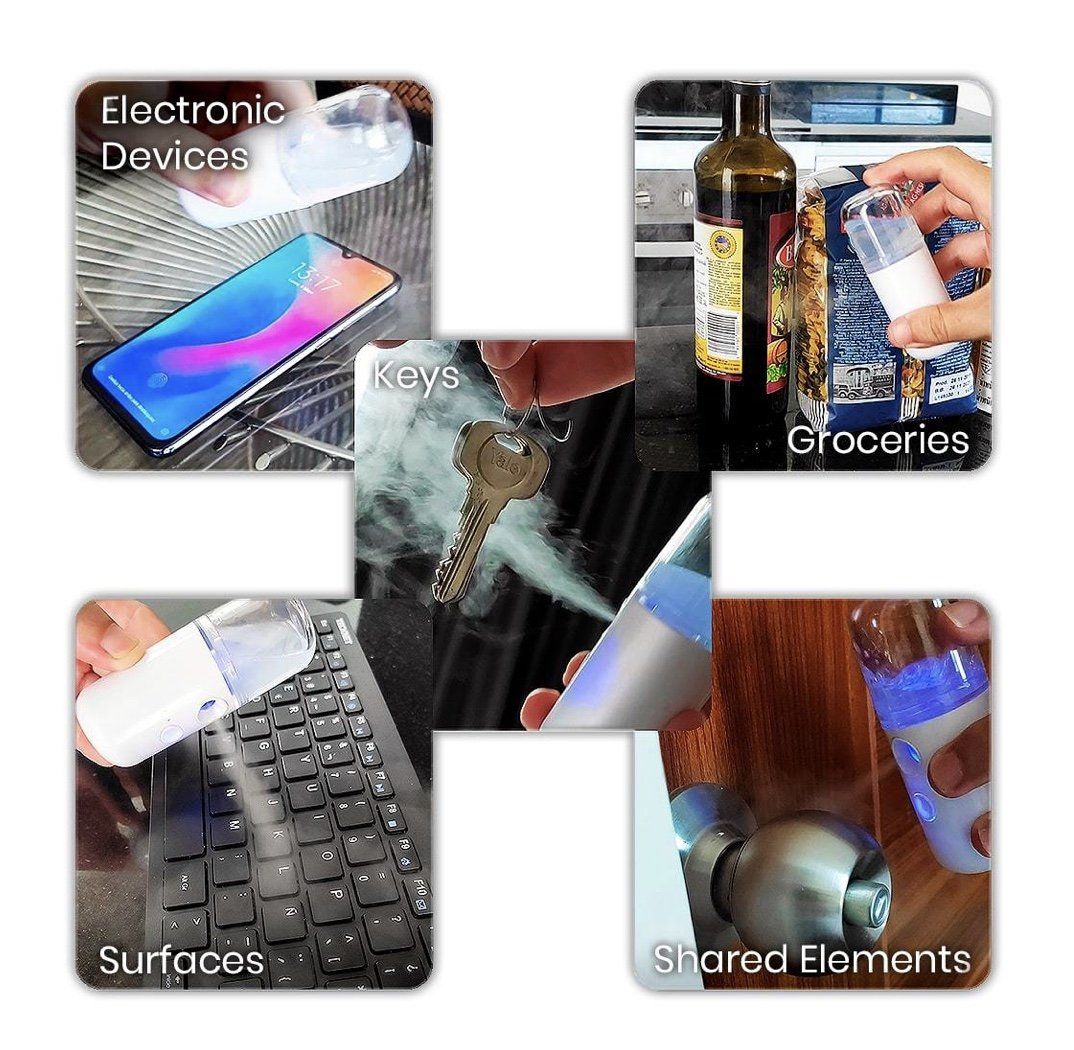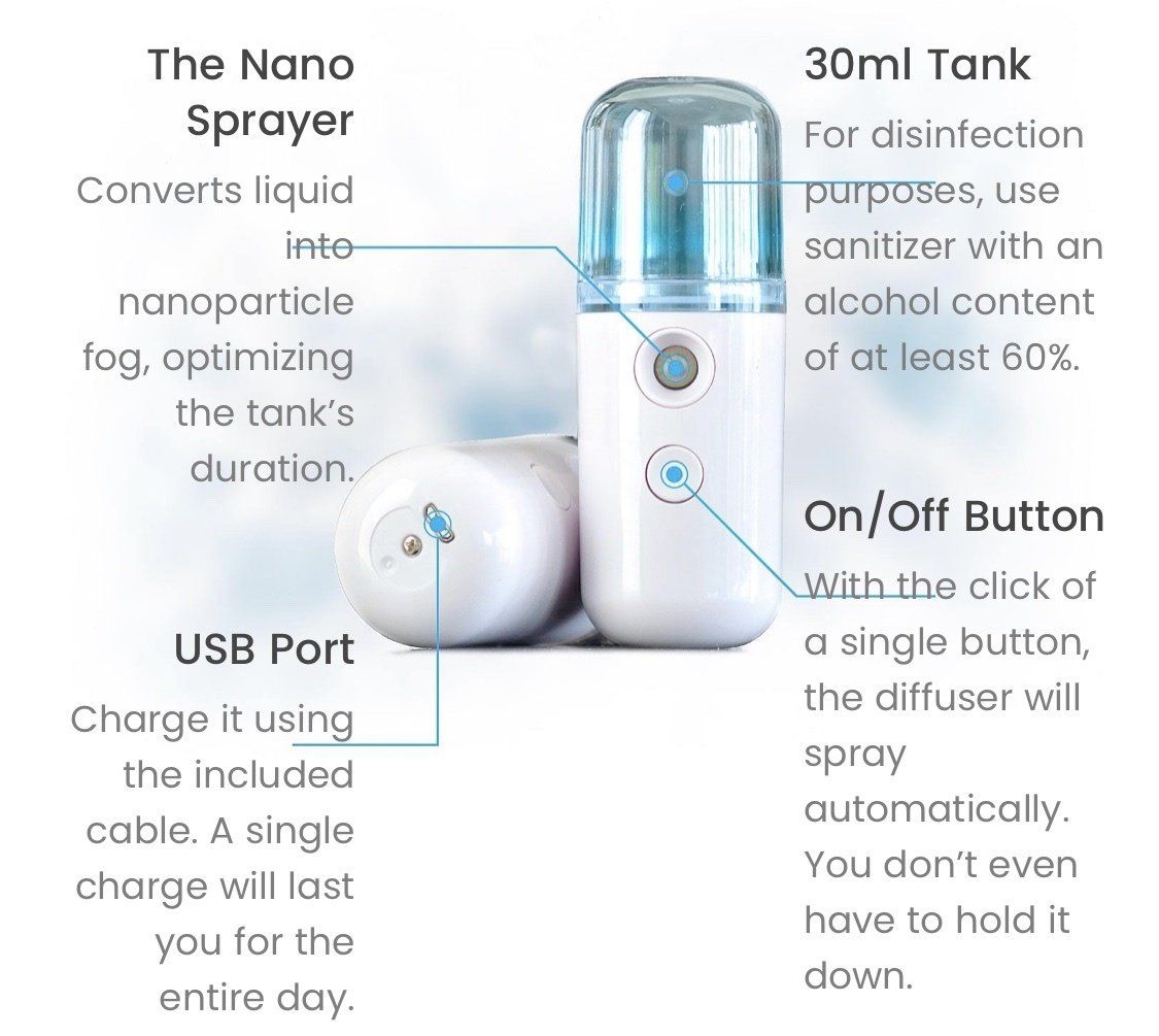 The personal sanitiser sprays liquid into nanoparticles which allows for greater surface coverage . The 30ml tank can be filled with lalcohol liquid and the lightweight design makes it very portable (Please note it must liquid not gel -99.9% alcohol liquid works well )